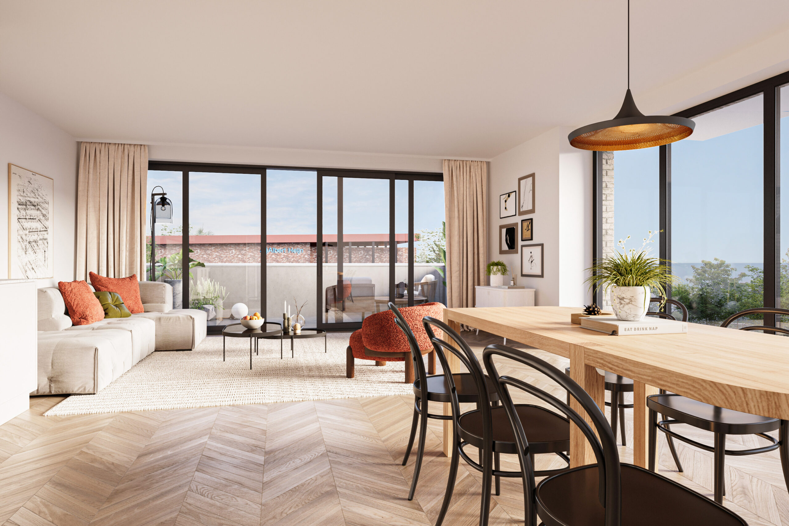 Het appartement beschikt over twee slaapkamers, een badkamer met toilet, een afzonderlijk toilet, een berging en een hal. De riante woonkamer/keuken is maar liefst 42 m2 en komt uit op het heerlijke ruime privé terras van 13 m2.